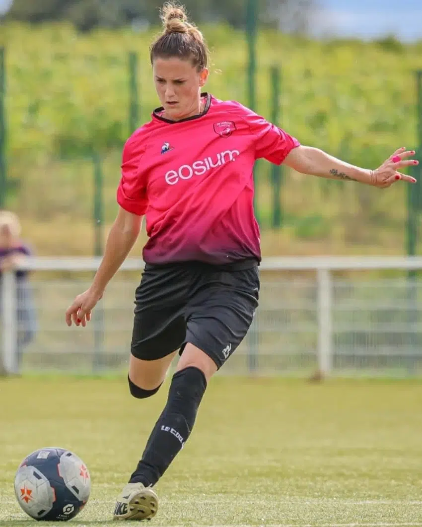 À 33 ans, Gwendoline Perraud ne tient pas en place. Auxiliaire de vie à Maisdon-sur-Sèvre et maman de trois enfants, elle vit sa vie à 200 %. Son secret pour garder la forme ? Le football, une passion qui dure depuis 27 ans. Pourtant, tout avait commencé par la gymnastique… avant qu’elle ne leur fasse rendre le tablier. « Ils ne voulaient plus de moi, ils ont dit à ma maman que j’étais un vrai lion en cage 🦁! » s’amuse-t-elle. Le ton était donné : Gwendoline était faite pour le rectangle vert.